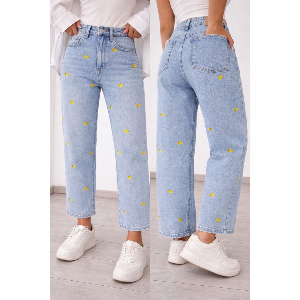 Světle modré džíny s drobnou žlutou výšivkou. Rovný střih mírně do zvonu lichotí postavě a prodlužuje nohy. Pohodlný pas a příjemný materiál zaručí komfort po celý den. Stylový kousek, který snadno zkombinujete s basic topy i košilemi.