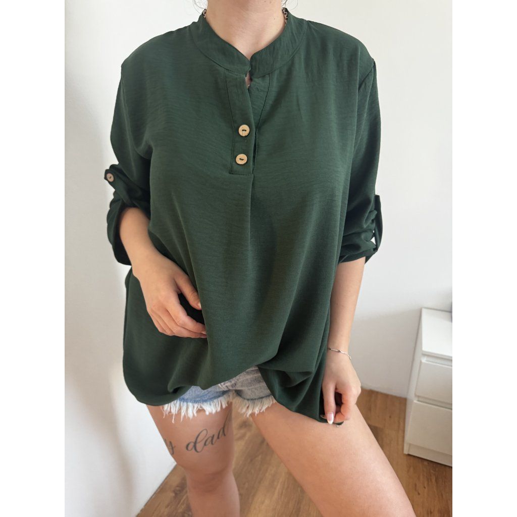 Detail knoflíčků u výstřihu dodává halence šmrnc a ohrnovací rukávy z ní dělají praktický i stylový kousek. Perfektně ladí s kraťasy, džínami i sukní – prostě univerzální must-have do šatníku.