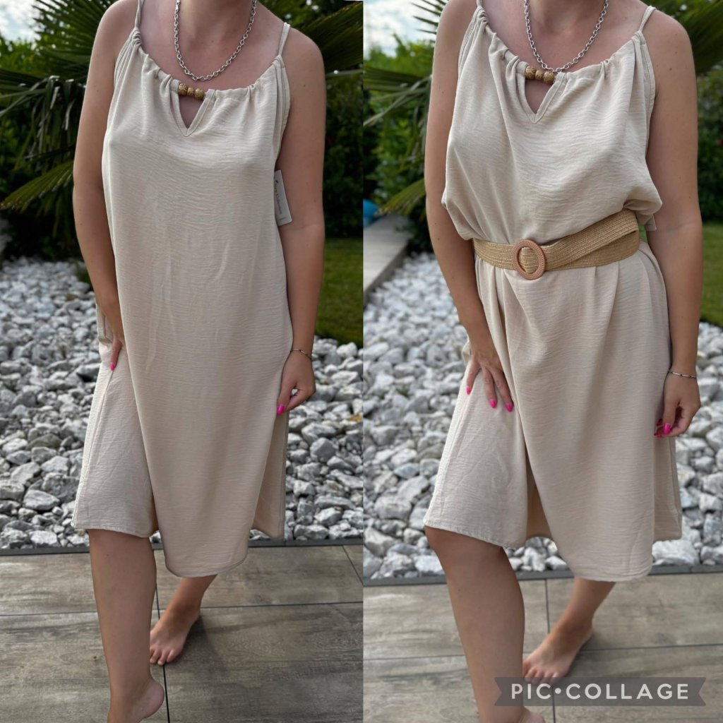 Lehoučké, vzdušné a maximálně pohodlné – přesně takové jsou tyto šaty v jemném béžovém odstínu. Volnější střih krásně splývá, nikde netlačí a je ideální na teplé jarní i letní dny. Díky jemnému řasení u výstřihu a decentnímu detailu působí šaty žensky a zároveň velmi přirozeně.