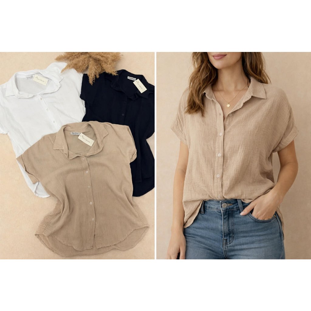 Lehká a vzdušná mušelínová košile, která se stane oblíbeným kouskem vašeho šatníku. Díky jemnému a příjemnému materiálu je ideální na teplé jarní a letní dny. Volnější střih zajišťuje maximální pohodlí a snadné kombinování – skvěle vypadá s džínami, šortkami i sukní.✨ Vlastnosti:příjemný, prodyšný mušelínový materiálkrátký rukáv a pohodlný volnější střihzapínání na knoflíčkylehká a nemačkavá strukturaideální na každodenní nošení i dovolenou👗 Styling tip: Noste volně přes kalhoty pro ležérní look nebo zastrčenou do pasu pro elegantnější vzhled.