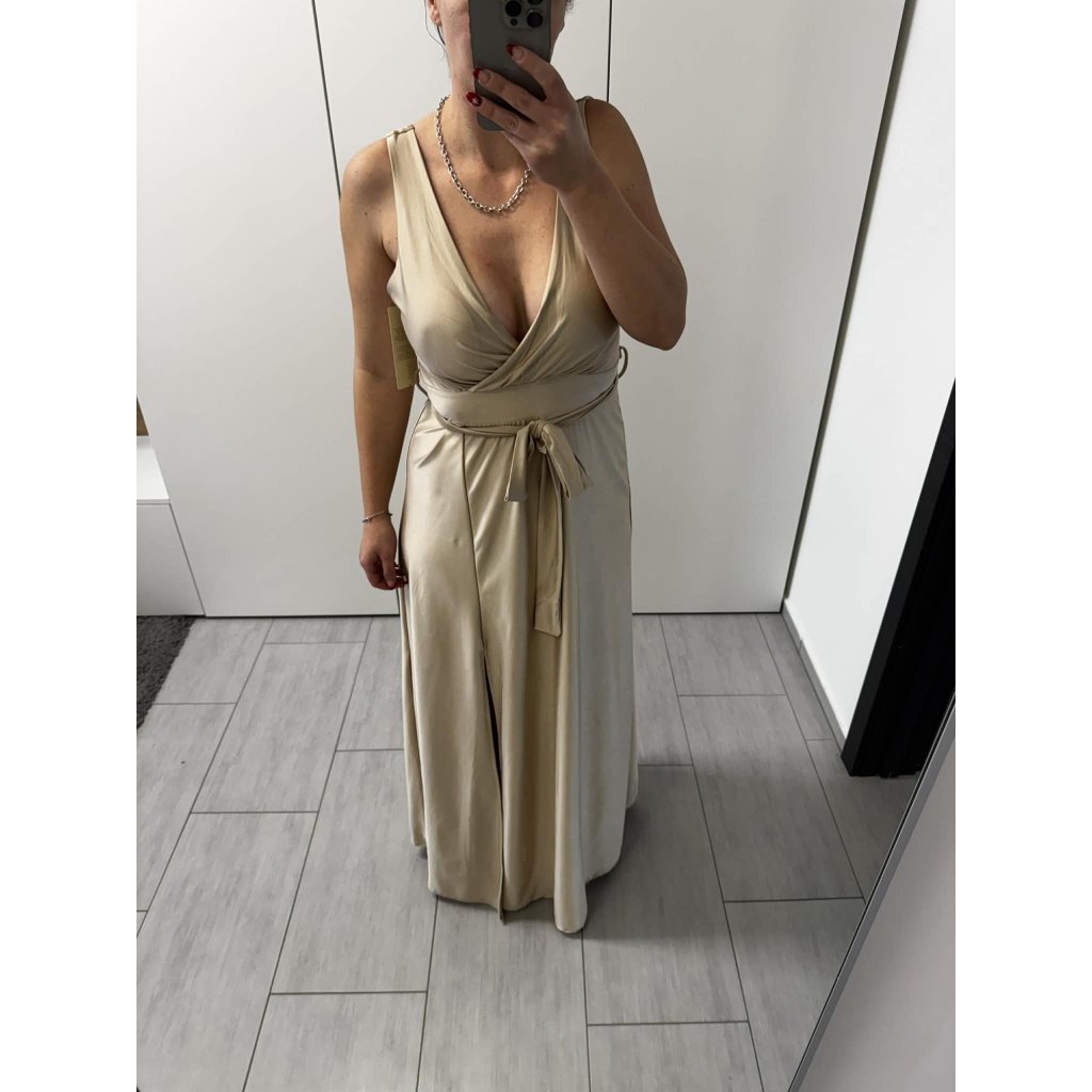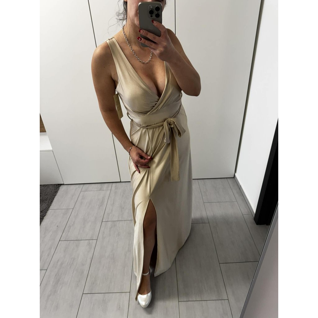 Elegantní dlouhé plesové šaty v luxusním saténovém provedení jsou ideální volbou na ples, svatbu, večírek či slavnostní události. Šaty mají hlubší véčkový výstřih, který krásně zvýrazní dekolt, a zavinovací střih, jenž lichotí postavě.V pase jsou šaty stažené vázacím páskem, díky kterému si snadno upravíte siluetu podle potřeby. Vysoký rozparek dodává šatům ženskost a eleganci, zároveň zajišťuje pohodlí při chůzi i tanci. Jemně lesklý materiál působí luxusně a splývavě.
