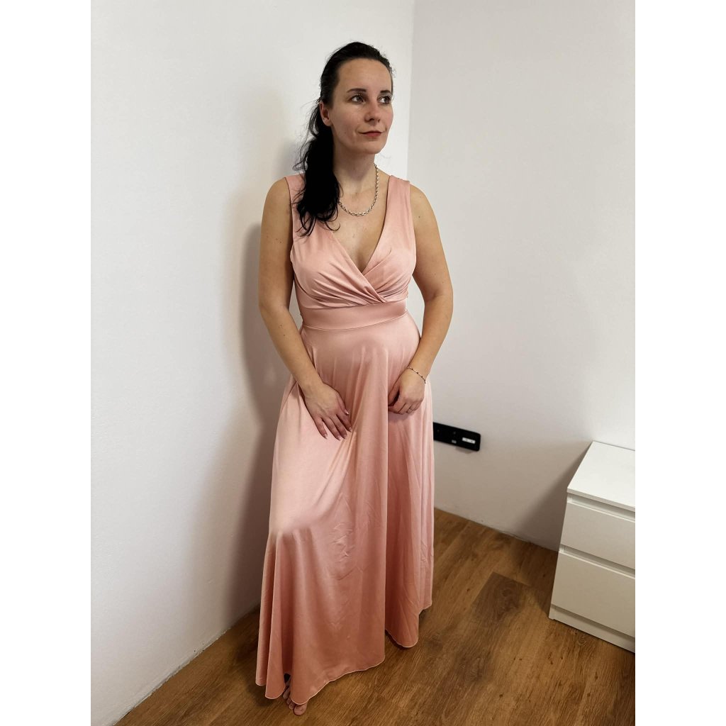 Elegantní a nadčasové pudrové šaty, ve kterých zazáříte na každé společenské události. Jemný splývavý materiál krásně kopíruje postavu, zvýrazní ženské křivky a zároveň působí velmi lehce a vzdušně.Horní část je řešena do lichotivého překládaného výstřihu do „V“, který opticky prodlužuje siluetu a dodává šatům sofistikovaný vzhled. Široký pas pod prsy zvýrazní linii pasu a dlouhá volně splývavá sukně dodává celému modelu romantický nádech a eleganci při chůzi.Ideální volba na ples, svatbu, oslavu, maturitní večírek i jiné slavnostní příležitosti
