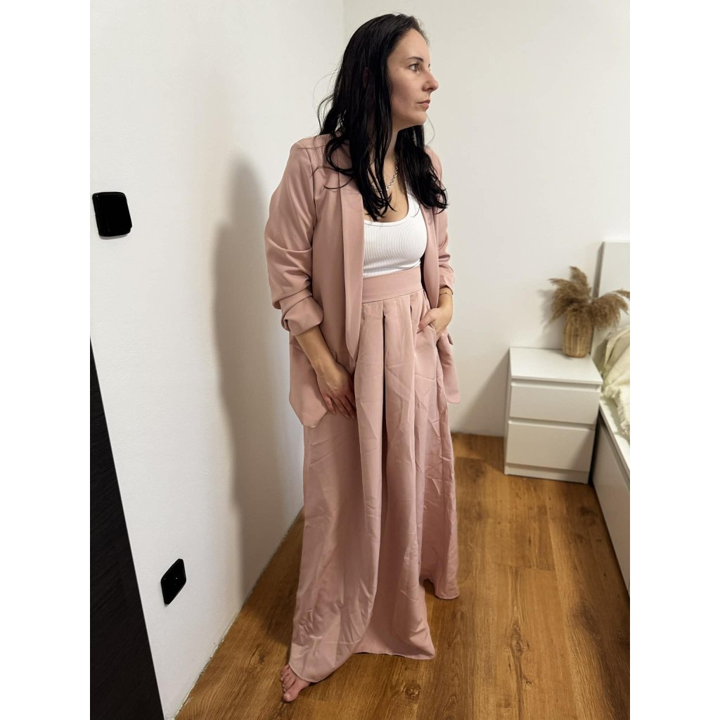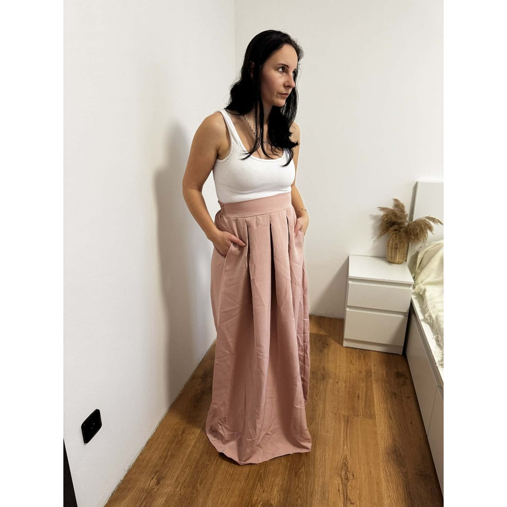Elegantní společenská sukně v maxi délce, která krásně splývá a působí velmi žensky. Vysoký pas lichotí postavě, opticky prodlužuje nohy a vytváří štíhlou siluetu. Jemně rozšířený střih se sklady dodává sukni vzdušnost a pohodlí při nošení. Praktické boční kapsy jsou stylovým i funkčním detailem.Sukně je ideální volbou na společenské události, plesy, svatby, oslavy, ale i na elegantní denní nošení v kombinaci s halenkou nebo topem.vhodná pro společenské i elegantní příležitostiTip na styling:Kombinujte s přiléhavým topem nebo krajkovou halenkou a lodičkami pro slavnostní vzhled, nebo s jednoduchým tričkem a sandálky pro elegantní casual outfit.