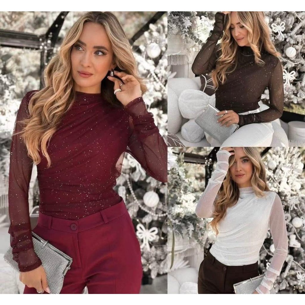 Elegantní halenka s jemným třpytem, která krásně podtrhne vaši ženskost. Díky lehkému síťovanému materiálu s dlouhým rukávem působí jemně, ale zároveň velmi slavnostně. Skvěle sedí na postavě díky přizpůsobivému střihu a efektnímu řasení.✨ Detaily produktu:třpytivý, lehce průsvitný rukávjemné řasení pro zeštíhlující efektkomfortní pružný materiálstojáček dodává elegantní vzhledskvělá na sváteční příležitosti, večírky i zimní oslavy