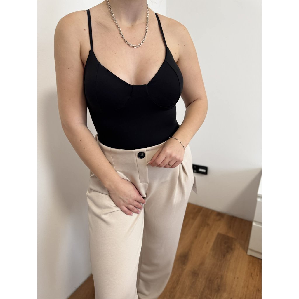 Stylový a nadčasový top, který krásně zvýrazní ženskou siluetu. Má jemná nastavitelná ramínka a tvarované švy v oblasti prsou, díky kterým perfektně sedí a vytváří přirozený tvar. Materiál je příjemně pružný, hladký a pohodlný na nošení po celý den.Skvěle se kombinuje s kalhotami s vysokým pasem, sukní i sakem – ideální jak na běžné nošení, tak i na večerní outfit.